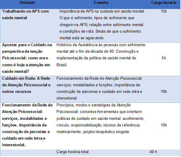 O curso tem como objetivo qualificar trabalhadores e trabalhadoras da Atenção Primária à Saúde (APS) para atuarem no cuidado às pessoas em sofrimento mental, fortalecendo práticas de atenção psicossocial, o trabalho em rede e a construção de parcerias no território.